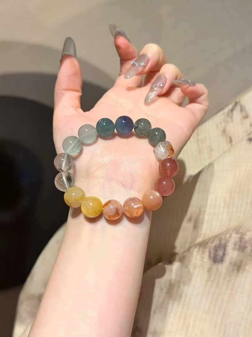 The entire bracelet uses a 'New Chinese' colour scheme: red, green, gold. The vibrant red of strawberry crystal and red resin flowers echoes the warm glow of sunstone; the cool tones of green rutilated quartz and fluorite balance the overall look, giving the bracelet a classic oriental charm. Red represents passion and good luck, green symbolises rationality and growth, and yellow accents bring wealth energy.