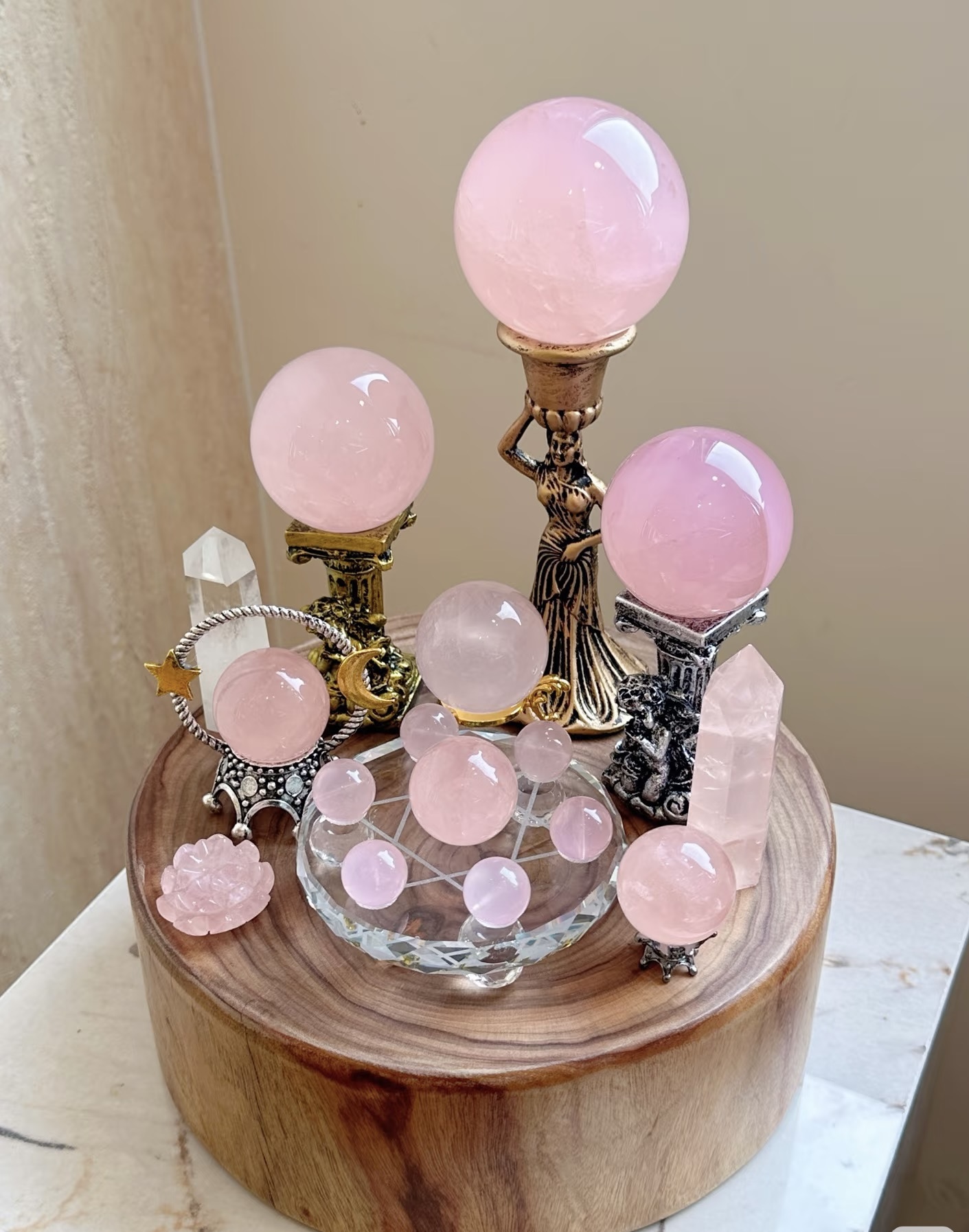 Pink crystal is the softest form of heart-shaped crystal, combined with the diffuse properties of spherical crystals, it fills the entire space with a pink aura and is a "good helper" for the flow of fate between people.