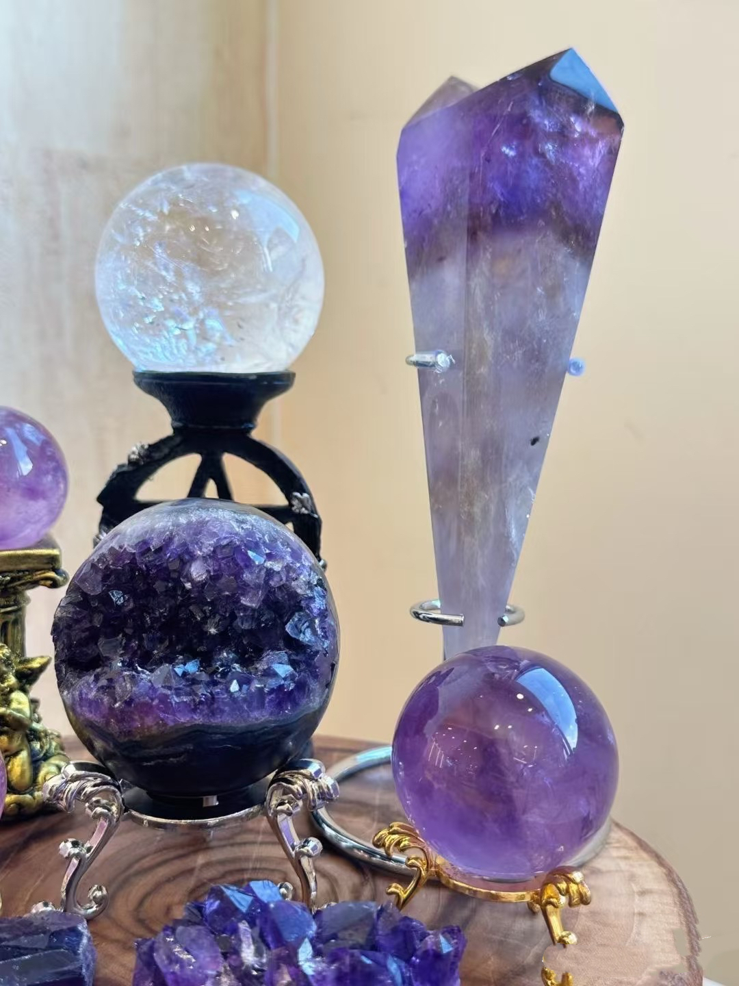 Natural Amethyst Laughing Buddha Ornament, Amethyst Geode, Money Bag and Treasure Bowl, Home Decoration, Housewarming Gift