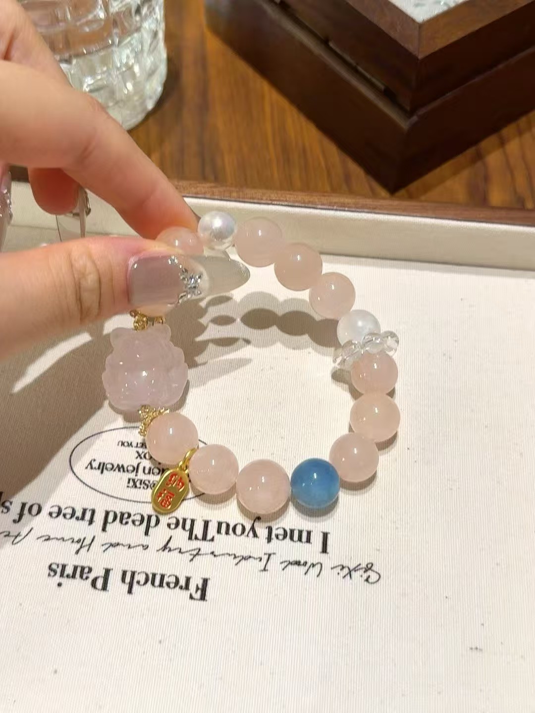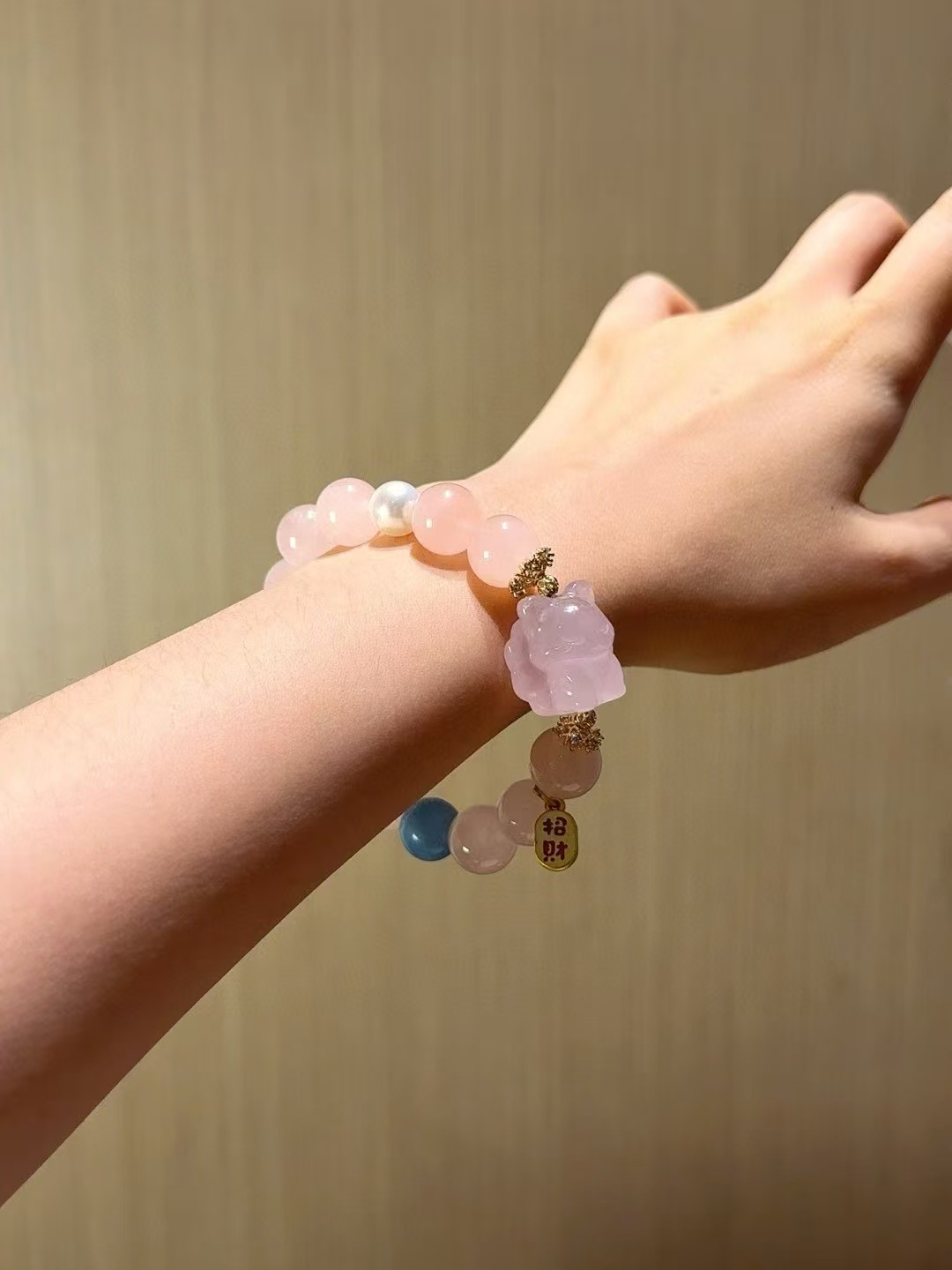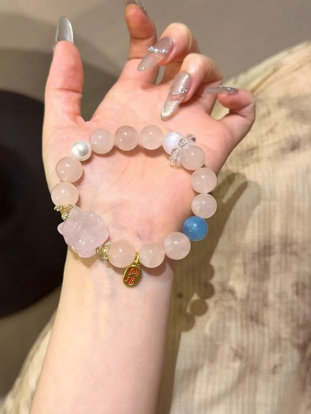 Gentle pink rose quartz paired with transparent aquamarine, accented with a lively blue moonstone, and complemented by a nine-tailed fox, creating a sweet yet mysteriously spiritual vibe. The small white crystal rollers shimmer and let light pass through, like a personal charm that locks in good fortune and energy~